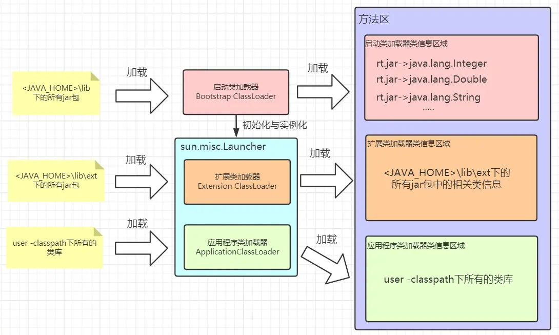 注意:每种类加载器加载的类信息都会存放在方法区的不同区域上,所以不同的类加载器如果加载相同的一个类字节码文件,在虚拟机看来生成的两个类对象是不相同的!如果有两个相同的类User,通过Application ClassLoader加载和Extension ClassLoader加载出来的两个User类对象,是不相同的。