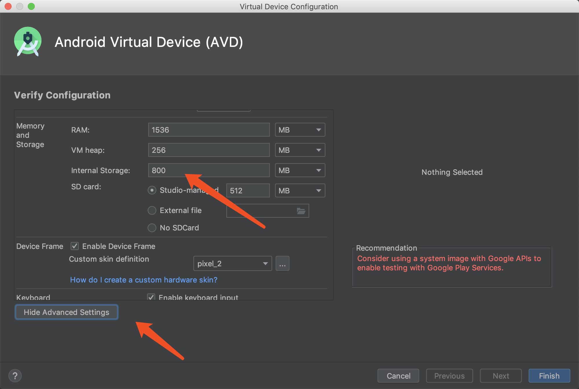 点击面板中的Show Advanced Settings显示高级选项并调整Internal Storage的大小: