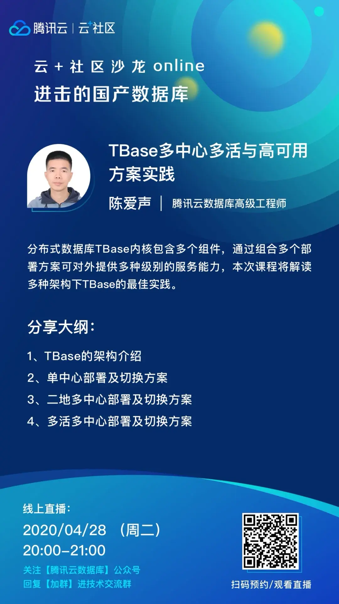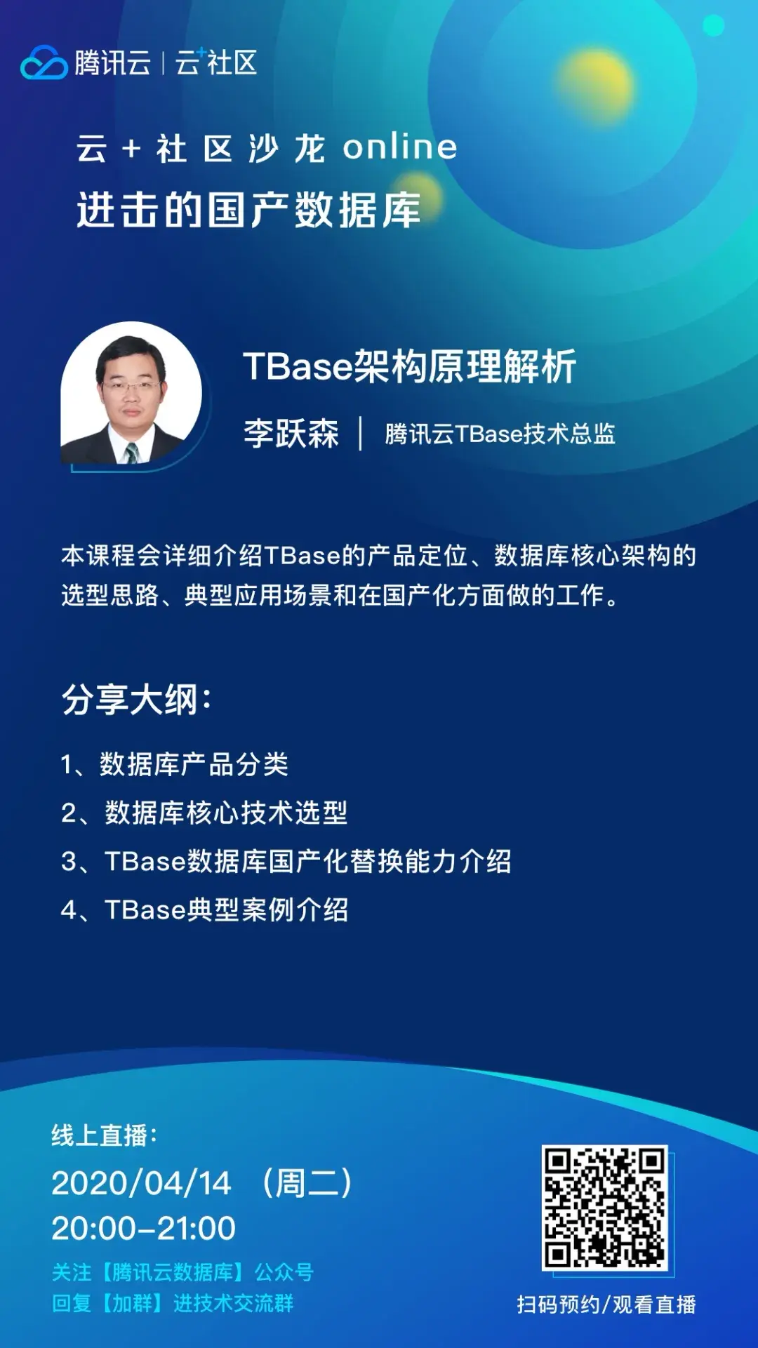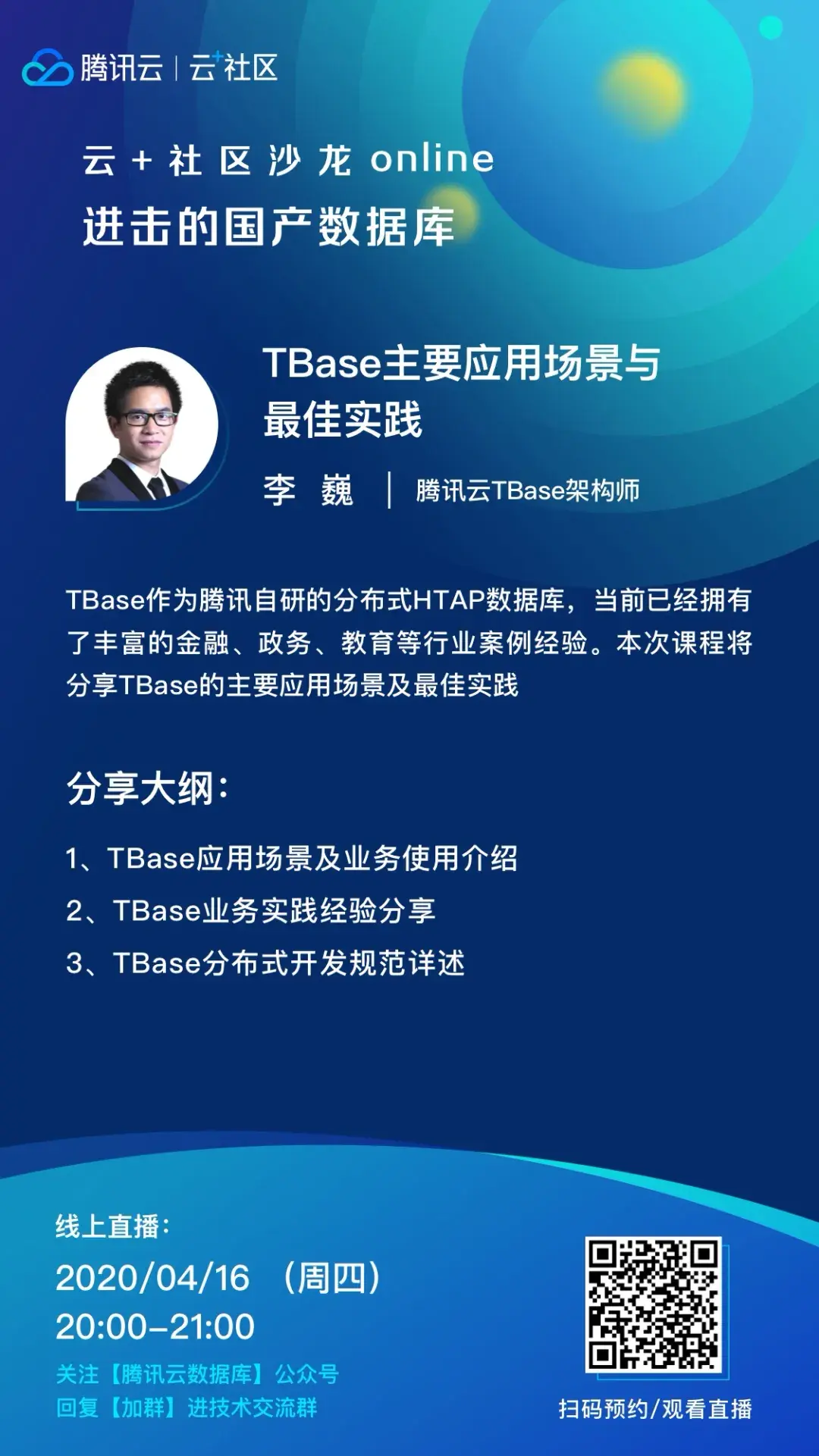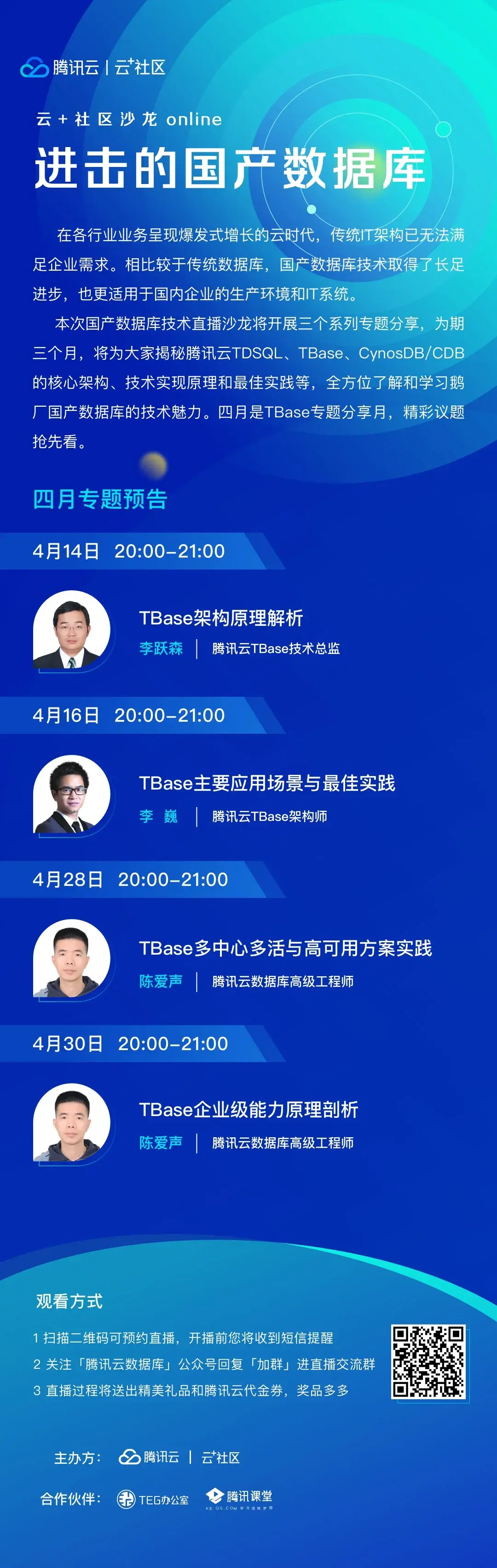 四月为TBase专题月,长按扫码下方海报,可一键预约全部直播。