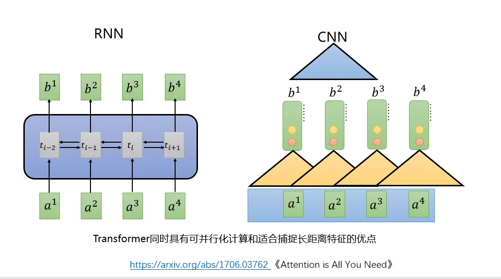 RNN(或者变种LSTM、GRU等)由于本身的机制只能按顺序依次计算,这种机制存在两个问题: (1)时间片t的计算依赖上一时间片t-1的计算结果,这样限制了模型的并行能力; (2)信息计算的过程中信息会丢失,虽然LSTM等通过门机制会一定程度缓解长期依赖的问题,但是对于特别长的依赖现象LSTM还是无能为力