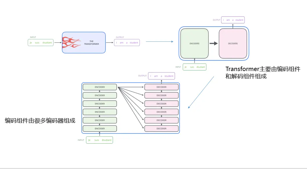 进一步剖析Transformer模型,主要有编码组件和解码组件组成。编码组件中包含很多个编码器,解码组件也包含很多个解码器。
