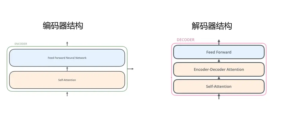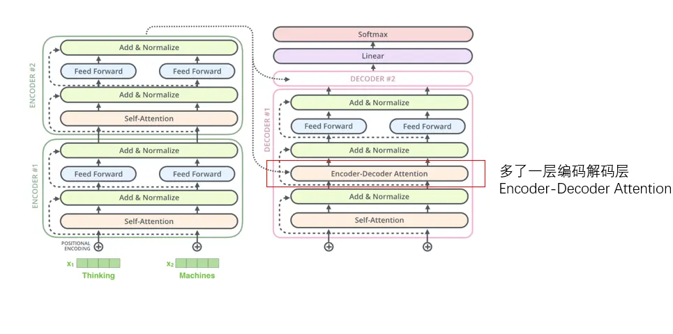 解码器和编码器很相似,也包含自注意力层和前馈神经网络层,另外还有一层编码解码层(Encoder-Decoder Attention)。