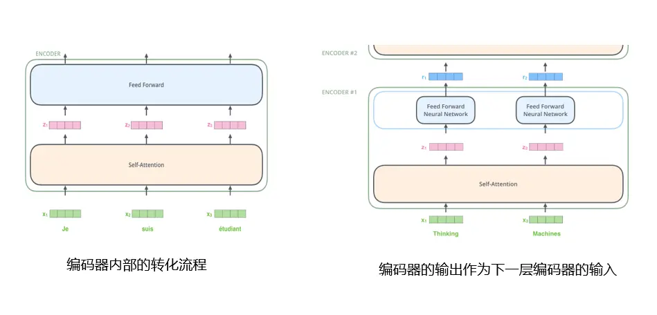 低层编码器的输出会作为上一层编码器的输入,不断进行,直到穿过整个编码组件。比如图5中编码器1的输入是词向量,编码器2的输入是编码器1的输出。编码器内部转化流程和编码器之间的转化流程如下图所示: