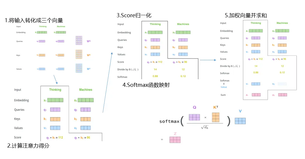 Transformer中最重要的就是这个自注意力机制Self-Attention。Self-Attention主要用于计算当前词对所有词的注意力得分,整个流程如下: