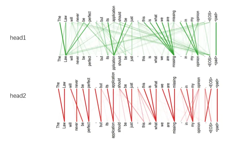 图9中分别有两个头head1和head2,通过是否有连线以及颜色深浅我们可以查看当前词对所有词的注意力得分。head1得到的注意力矩阵更多的关注距离较远的词,head2则关注的是距离较近的词。可以看出不同的头关注的点是不同的。