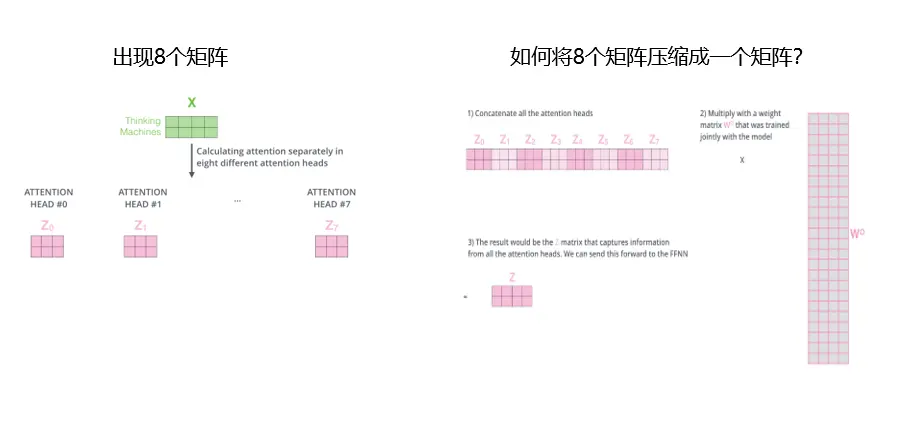 现在出现一个新的问题:编码器中从自注意力层到前馈神经网络层过程中,前馈神经网络仅需要一个矩阵。现在因为多头注意力机制,出现了八个头。如何将这八个头压缩成一个头?