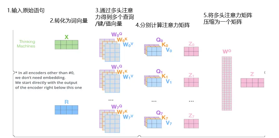 Transformer默认使用8个注意力头。这样每个编码器就能得到8个矩阵。论文默认使用的是8个头,可调。