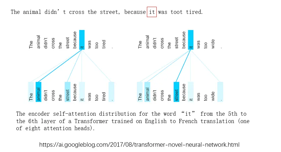 有意思的是,如果我们修改语句,将其中的"tired"改成"wide",奇迹出了,Attention能很好的识别到"it"代表的是"street"。