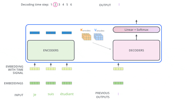 这里需要注意的是解码器第一轮的输入是一个特殊的开始标志符号,使用编码组件输出的K、V注意力向量集,输出是需要翻译的第一个词。