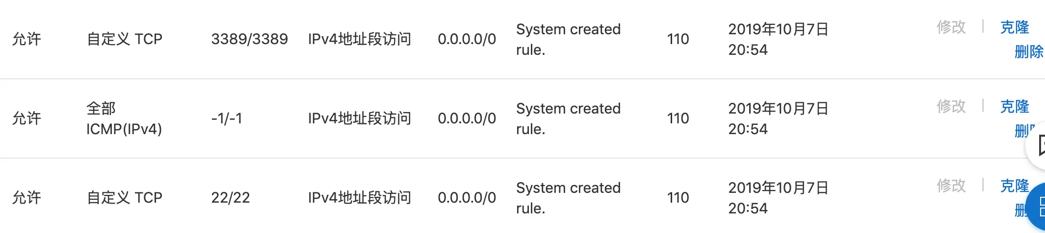 最后弄了很久才发现是,虽然创建好了安全组规则,但是我并没有保证 ECS 被放在安全组中,一般阿里云系统会自动帮你生成一个安全组,里面会有一些基本规则,这些基本规则我看了一下:
