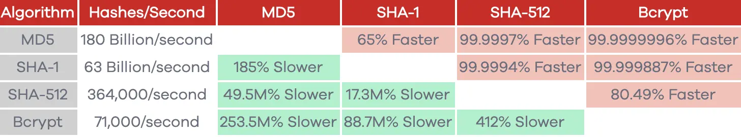 另一方面,bcrypt每秒仅能执行71,000次哈希。这比MD5慢253,500,000%,比SHA-1慢88,700,000%,甚至比SHA-512慢412%。