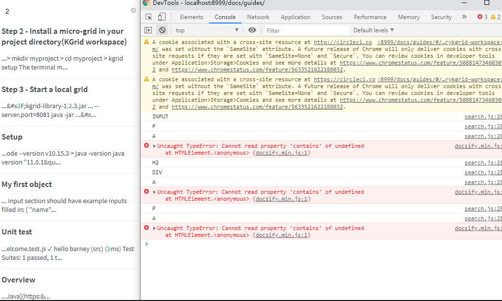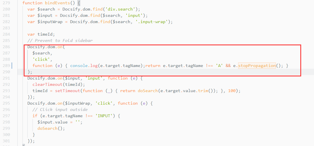 docsify搜索组件无法定位的bug解决方案 CCCCCCC 2020-04-10 1,742 阅读1分钟 具体体现在使用search插件时,点击搜索结果页面无法定位到匹配的地方。 原因 查询后,这是因为搜索源代码有错误。 如图所示,在大多数情况下,触发click事件的元素不是A标签。 这时,stopPropagation事件会导致docsify源代码中的一个属性为false。导航= false,因此source = history,因此将不会触发相应事件从而无法定位 解决方法 注释此代码即可