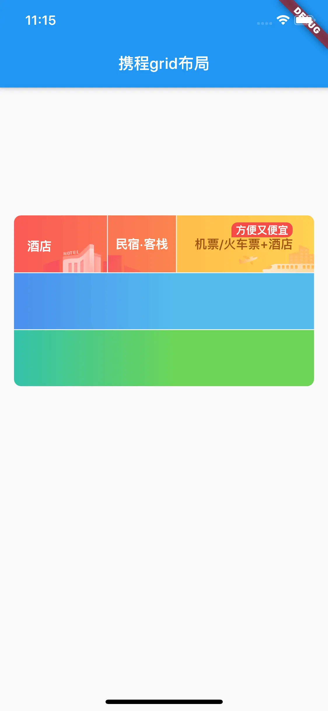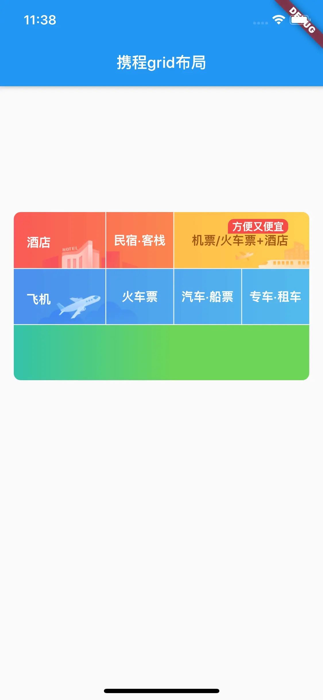 _flightRow()中的// todo: add flight row为如下代码;child: Row( children: <Widget>[ _firstBGimageStack( imageUrl: _flightBGImageUrl, imgWidth: 79, title: '飞机', ), _secondBGImageStack( imageUrl: _trainBGImage, imgWidth: 37, title: '火车票', ), _noBGImageStack(title: '汽车·船票'), _noBGImageStack(title: '专车·租车'), ], ),然后