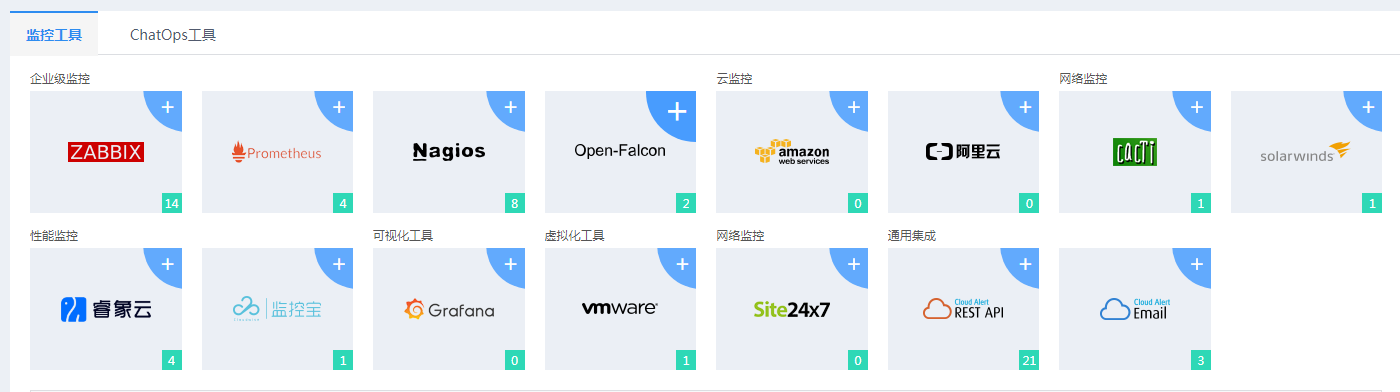 用户可以将多个监控平台接入到CA当中进行统一管理,目前支持的平台有Zabbix、Prometheus、Nagios、Open-Falcon、AWS、阿里云、Cacti、Solarwinds、睿象云、监控宝、Grafana、Vmware、Site24x7、如果上述都没有支持你的监控系统,那还可以用通用集成Rest API和邮箱集成。