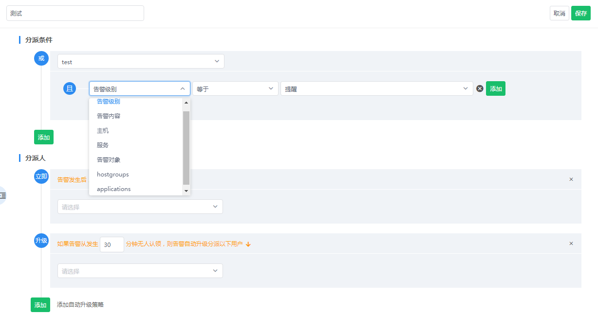 用户可以根据不同的应用,选择多种分派条件,使得告警通知的到指定的人,达到告警的多样化分派,并且用户也可以设置延迟分派策略,使得告警二次或多次通知,避免遗漏重要告警通知。