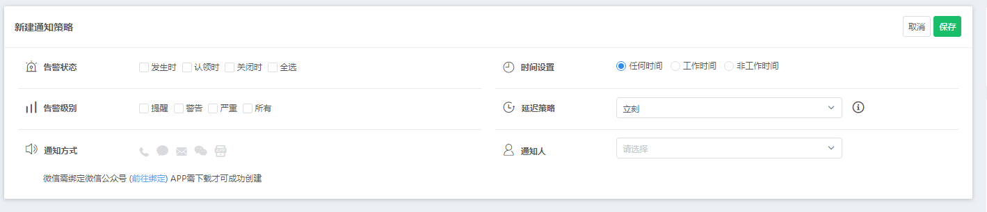 用户可以根据告警不同的状态、不同的时间、不同的级别,以不同的方式,通知到指定的人,目前支持的通知方式有电话、短信、微信、邮件、APP。用户也可也选择是否延迟通知。