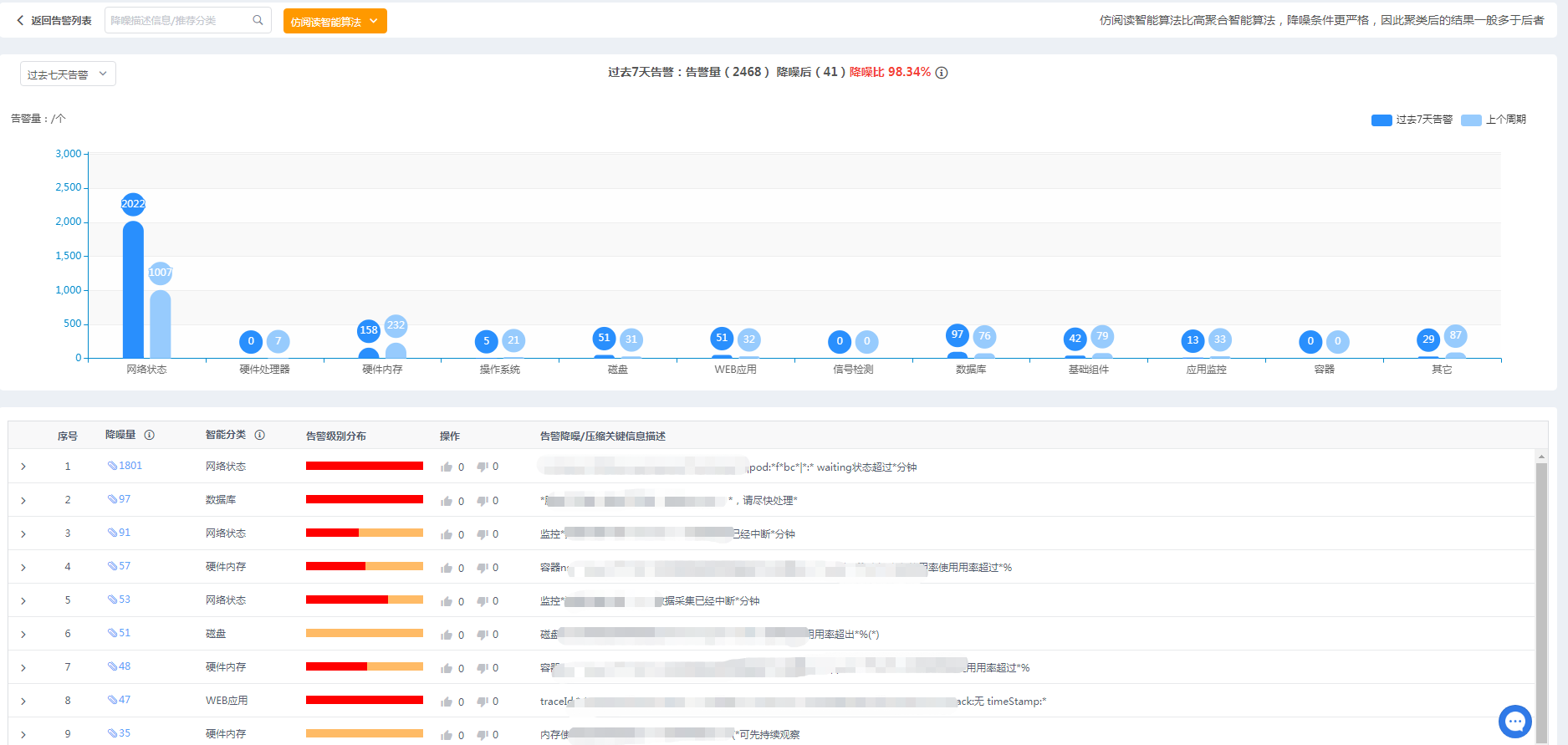 用户可以通过高聚合智能算法降噪或者是仿阅读智能算法降噪,从而达到事后告警的分析效果,使得用户可以发现告警的主要根因问题。