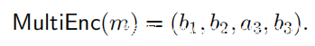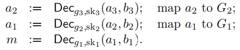 不知道这种多级加密的目的。但是,显而易见的观察是,如果在G1,G2和G3中离散对数问题不难解决,则可以从公钥pki’推导出秘密密钥ski’ ,然后攻击者可以与秘钥的合法拥有者一样快地解密加密的消息。
