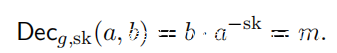 然后,使用对应于pk的秘密密钥sk的相应解密函数Decg,sk(a,b)给出: