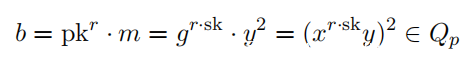 明确一点,如果消息m在映射到Fp之后变成二次残差,则对于加密算法的每种随机性选择,在所得密文Encg,pk(m)=(a,b)中,第二个分量b也为二次残基,如果g和m属于Qp,则在Fp中存在x和y,使得g = x^2和m = y^2: