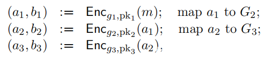 用g1,g2,g3表示3组G1,G2,G3的生成器。有3个ElGamal密钥对(sk1,pk1),(sk2,pk2),(sk3,pk3)用于选票的加密和解密。为了加密消息m∈G1,计算以下连续的ElGamal加密: