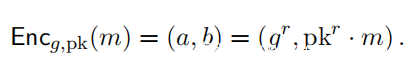 用Encg,pk(m)=(a,b)表示用公钥pk和生成器g对消息m∈G的ElGamal加密。这是一种随机加密,在Zq中随机均匀地选取一个整数r,然后将其加密为:
