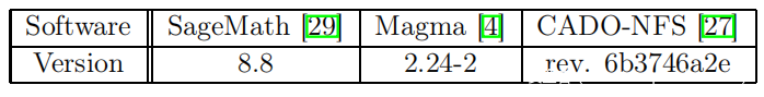 请注意,Magma是专有软件,而其他是免费软件。实验首先在配备了4核Intel i5-4590处理器,3.3 GHz频率和16 GB RAM的典型个人计算机上进行。它运行标准的Debian发行版。SageMath内部使用GP / Pari 计算离散对数。在这台机器上,计算耗时超过12个小时,实际上必须在运行4天后将其停止。