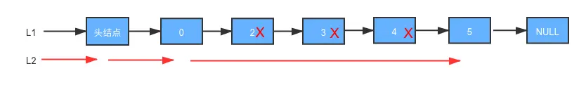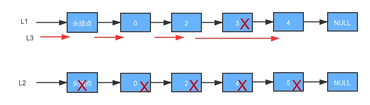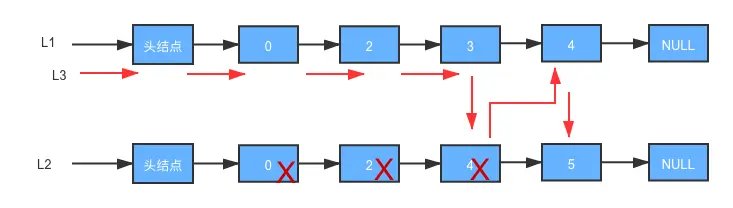 //pa 中的数据等于 pb中的数据,便将pa赋值pc 的后继结点,将pb 当前结点赋给 temp,pb释放,pa,pb 后移