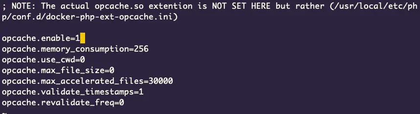 默认opcache.enable=1是开启状态 我们此时改成0,但是当我们重新build之后是无效的,因为上方的第一句话:NOTE: The actual opcache.so extention is NOT SET HERE but rather (/usr/local/etc/php/conf.d/docker-php-ext-opcache.ini)大概意思是opcache.ini的文件不在当前文件,其实在php-fpm容器中的usr/local/etc/php/conf.d/docker-php-ext-opcache.ini