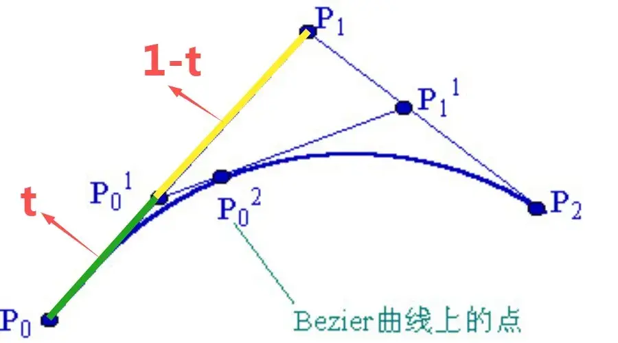 通俗的来讲,n阶的贝塞尔曲线就是被2个固定点(起始与终止点)以及(n-1)个可拖动支点控制的均匀线段。也就是说n阶曲线需要(n+1)个点来确定。以下我以二阶贝塞尔曲线为例,阐述它的几何含义和简单推导。