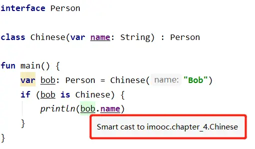 对象bob已经经过了类型判断,再进行强制类型转换是多余的。在这样的情形下,Kotlin编译器将为我们进行智能类型转换。