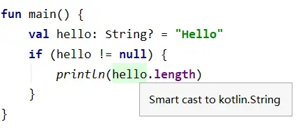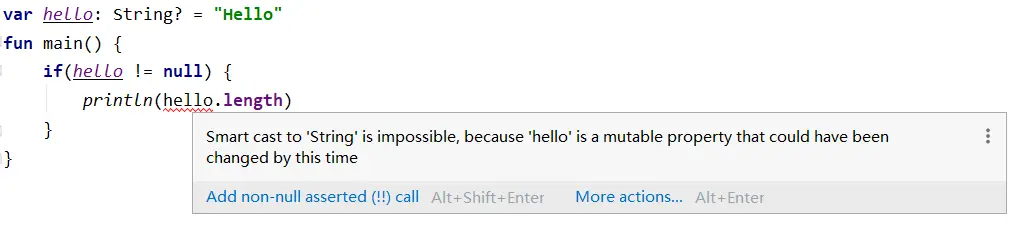 IDE告诉我们,此情形下的hello变量是一个全局变量,可能被main线程之外的线程访问修改,因此,即使已经有了hello != null的判断,也不能保证hello在被使用时是非空的String类型。因此,无法进行智能类型转换。