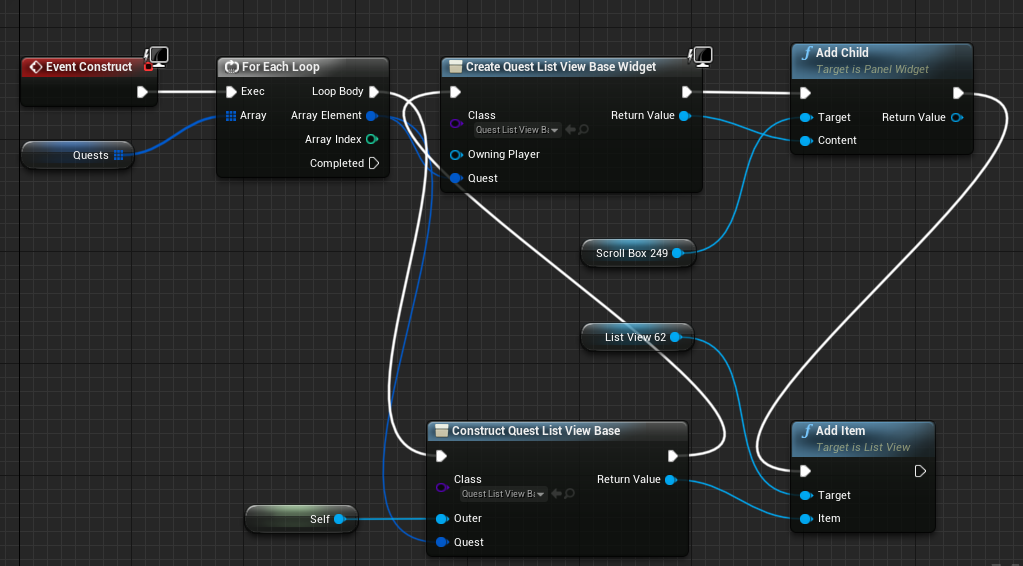 蓝图使用ListView添加条目的问题 pinkman9627 2020-04-10 688 阅读1分钟 问题:使用UHD给ListView AddItem时,启用Expose on Spawn的变量,在CreateWidget时并没能把值(例子中的Quest)传给Entry(例子中的QuestListBase),导致不能在外面更新list条目的数据。 分析: Entry中Event Construct是在AddChild之后触发,这时外层创建的Entry Widget数据已经为传入的值,但是Event Construct输出的值确还是default value. 外层AddChild等待2秒后输出的Quests数据仍然跟Entry的Event Construct中输出的数据不一样(所以他们各自独立?) 推测:创建Widget(有外层输入),在作为条目被AddChild后列表又重新generate了条目(这里没有外层的输入),所以是两个不相干的instance 解决方案: 不使用ListView情况下使用AddChild(不会重新generate) 使用ListView情况下使用Construct Object from Class,在指定的Class中Class Settings添加Interface:User Object List Entry,获得事件Event On List Item Object Set,然后可以把输入值应用到相应的变量上。