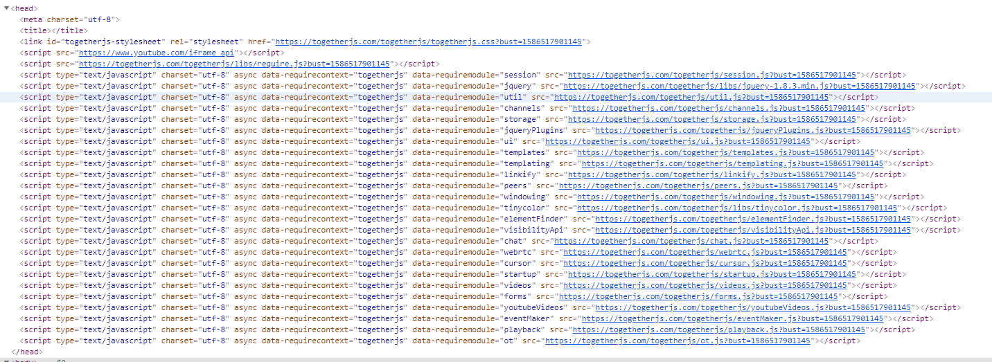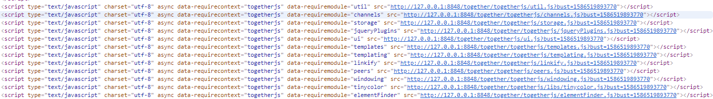 这时很多人就会像我一样丈二的尼姑摸不到头脑。为什么突然增加了这么多的文件,都是做什么用的。其实对着data-requiremodule变量和togetherjs的功能,大概能猜出各个文件的用途。包括日志,聊天,webrtc,样式,存储等等(其实我也还没全了解😁)。但是就是这些文件,实现了togetherjs的功能。咱们继续往下看。