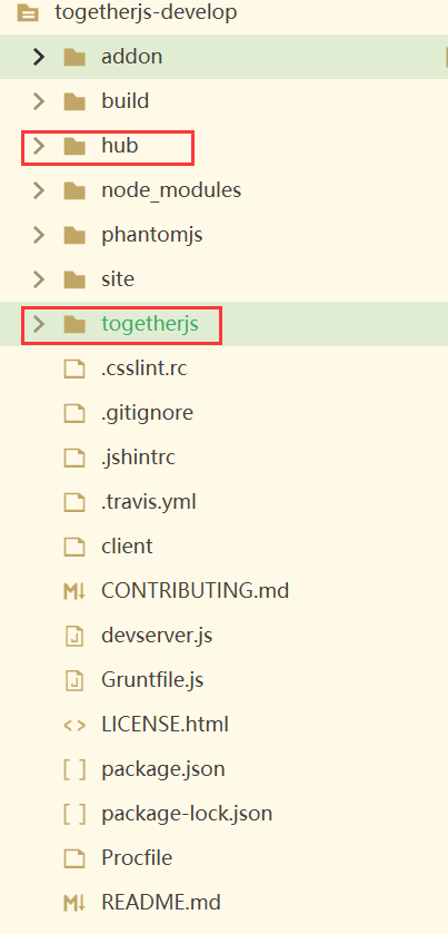 - git clone github.com/jsfiddle/to…, 默认是develop分支。文件目录结构如下,主要是下面两个文件夹,一个是togetherjs,需要引入的文件夹,一个是hub,ws服务端的文件夹。