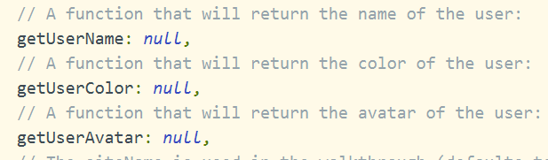 如果我们想修改名字,头像,颜色这些配置,透过官网我们能找到答案。透过togetherjs文件的defaultConfiguration字段我们也能找到配置,注意 这三个字段都是函数
