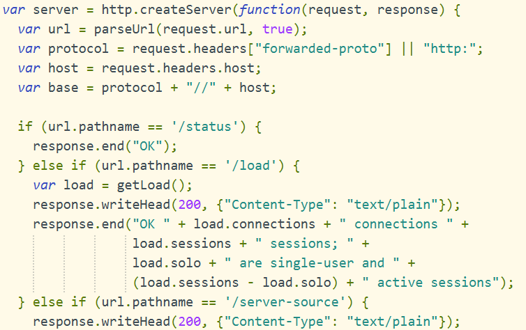 主要内容在server.js文件中, 从http.createServer 方法可以看出,服务端的几个状态,/status,页面显示ok,表示服务成功,/load显示当前客户端链接数,页面active的数量等。