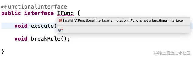 从概念上来说,一个函数式接口只能有一个抽象方法。因为Method当中的isDefault()已经有一个实现,而且它们不是抽象的。如果一个被接口声明的抽象方法重写了Object的一个公共方法,那么它也不计算到接口抽象方法,因为接口的任何实现都会来自Object或者其他地方的实现。