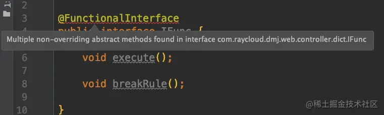 - 带上了这个注解,那么编译器就会语法校验。在Java语言规范下只能有一个抽象方法,当然重写Object的方法除外。