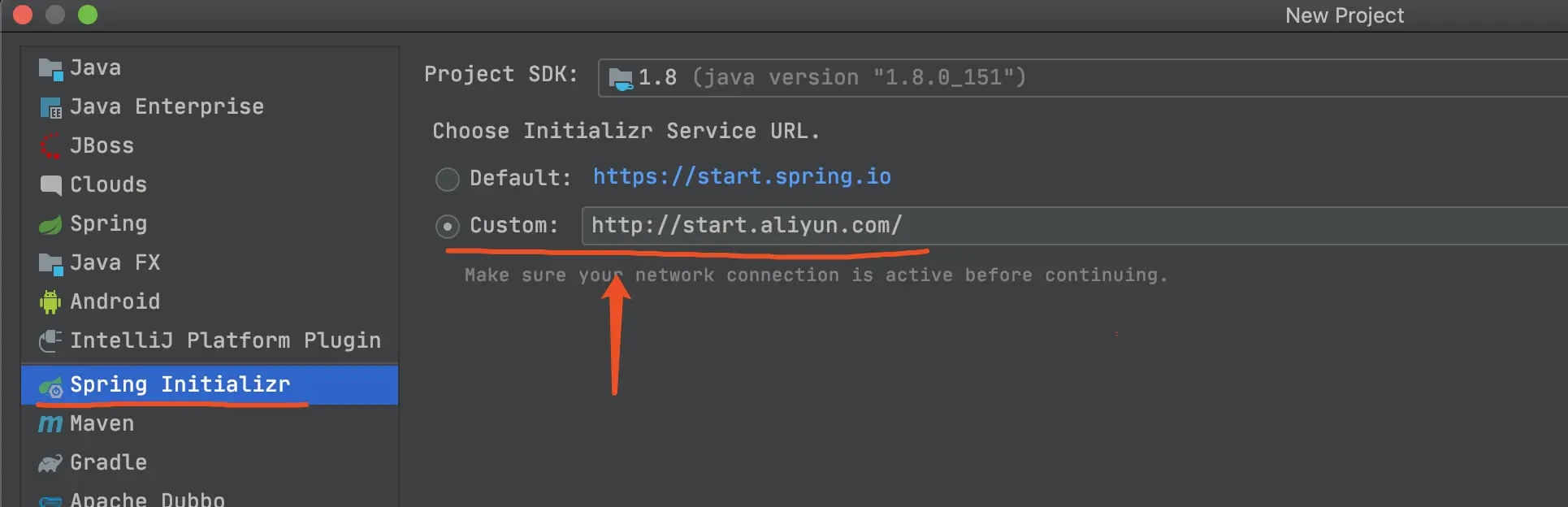 第二步:左侧项目类型中选择“Spring Initializr”,右侧可以看到模式使用的是Spring官方的脚手架地址,我们只需要选择custom,然后填入https://start.aliyun.com/,点击“Next”!