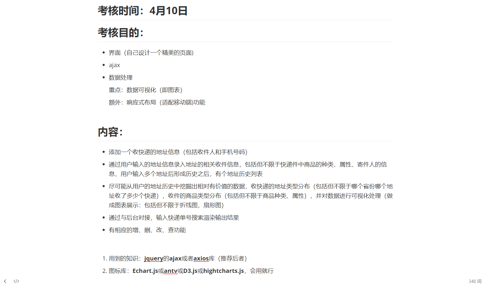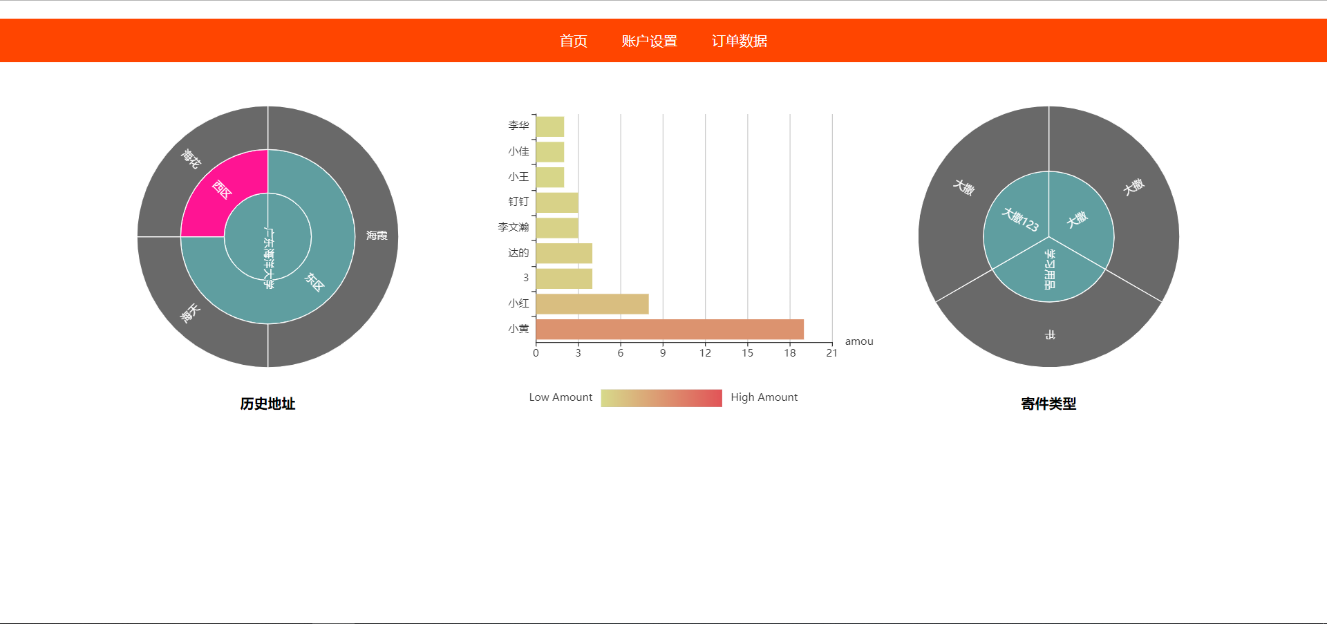 第一篇博客,记录一下师姐安排考核任务,用到的技术为html+css+javascript+vue.js 简单的过了一下vue.js的文档就开始写了运用了双向数据绑定动态更新表单,事件监听用 v-on 指令调用methods 内的方法,用computed对象内的方法加载页面的历史数据,使用v-show来控制页面的展示,class 属性绑定来更新事件后的样式,媒体查询+flex布局实现适配移动端(写的很烂),localstroage+json储存历史信息,Echarts写了三个图表,两个旭日图展示历史记录,一个柱状图从后台获取所有用户的快递信息展示最大收件量的9个用户。
