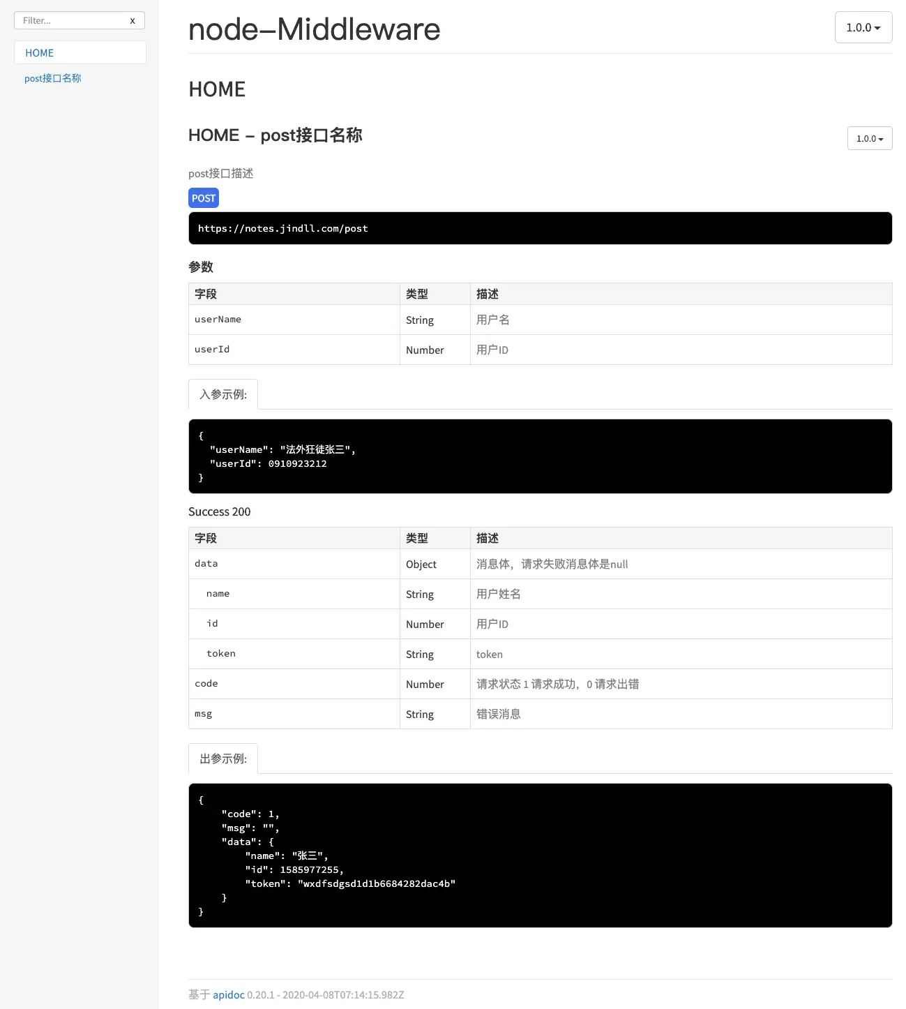 {POST} 请求方式,即上方页面的蓝色标签/post 即蓝色标签下面的完整接口地址,前方的域名来源于 package.json 文件 apidoc.urlpost接口名称 即显示在页面侧栏的接口名称和HOME - post接口名称 |