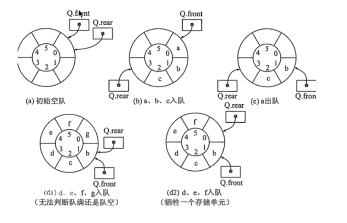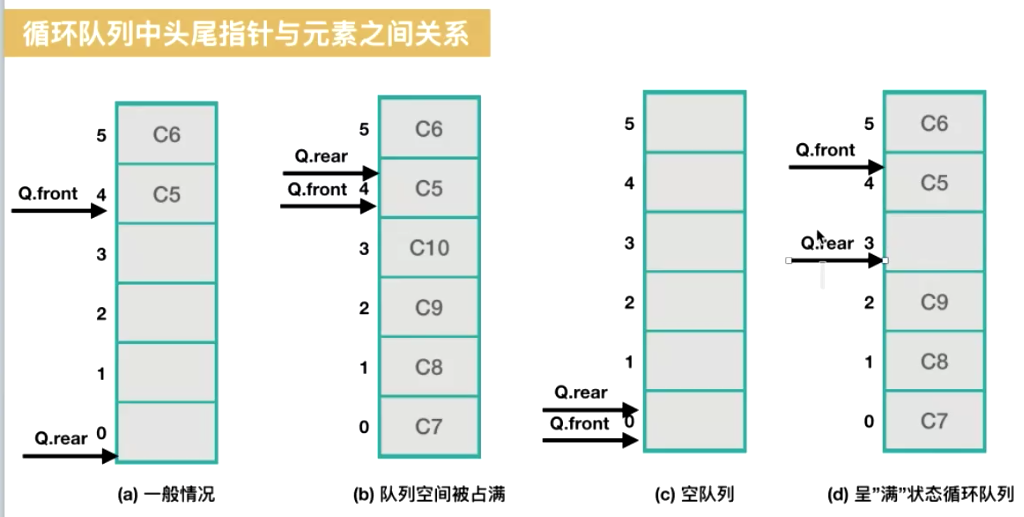 - 判断队满 (Q.rear + 1) % MAXSIZE == Q.front