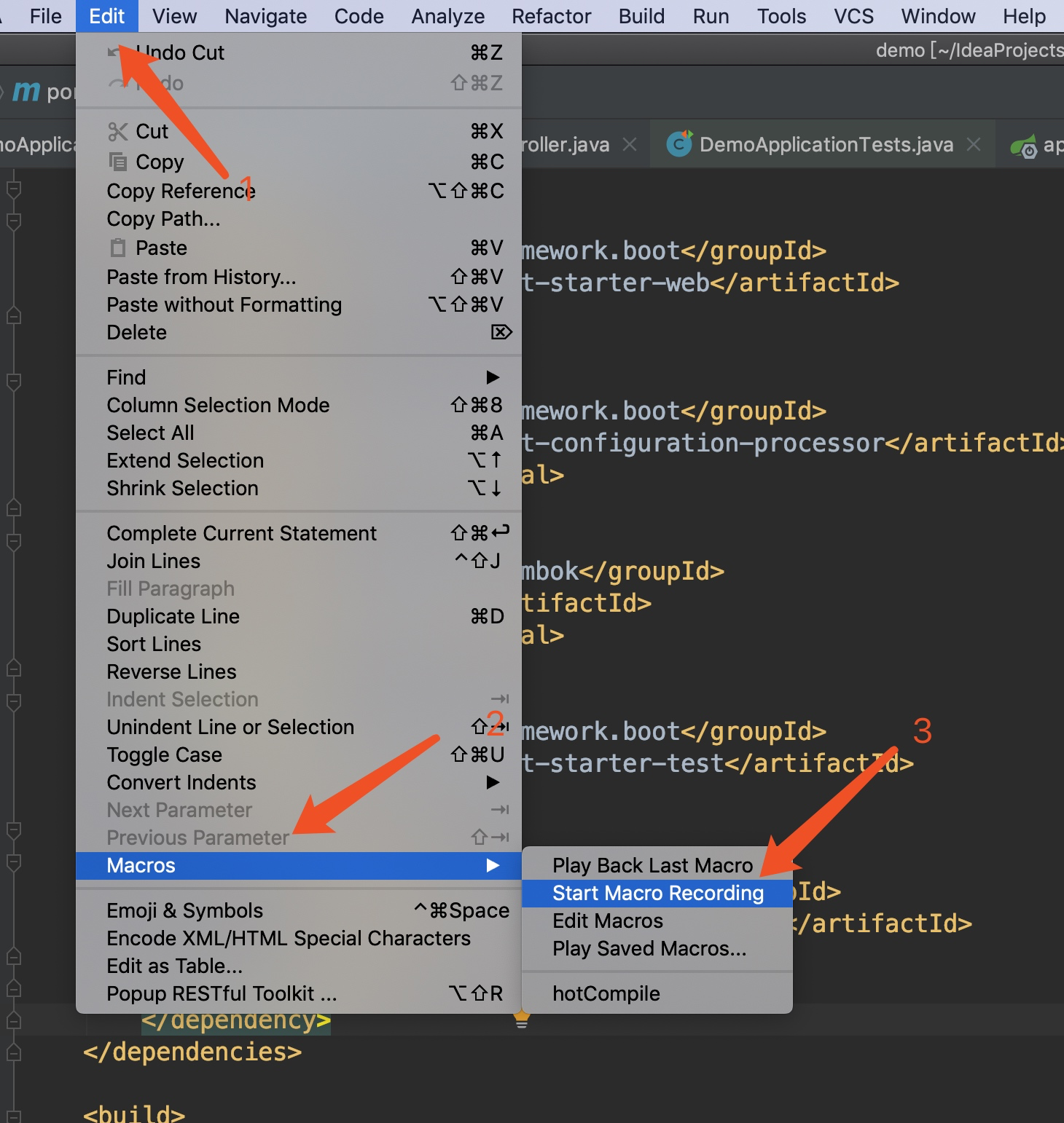 1、开启宏录制 edit->Macros->Start Macro Recording