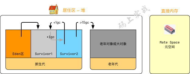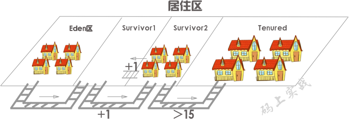 工人诞生后会分配到Eden区,当Eden区人员快满时,垃圾小分队会来清扫,清扫后如果工人还活着,那么他们将搬迁至Survivor区中的其中一个,当这个Survivor快满时,垃圾小分队会将还活着的工人搬迁至另一个Survivor区中,就这样重复着,每经历一次垃圾小分队的清扫,活着的工人就会长大一岁,直到工人的年龄达到15岁,到达后会将他们搬迁至老年代生活的地方。但也有例外,如果某个工人吃的太胖,新生代容不下他,那么他将直接去老年代住下。当老年代快住满时,将会有垃圾大扫除(full gc)。