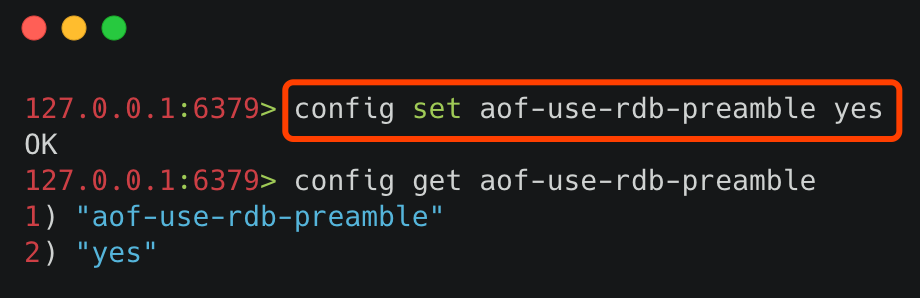 config set aof-use-rdb-preamble yes 执行结果如下图所示: