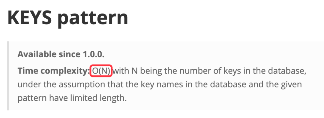 Redis 绝大多数读写命令的时间复杂度都在 O(1) 到 O(N) 之间,在官方文档对每命令都有时间复杂度说明,地址:https://redis.io/commands,如下图所示:
