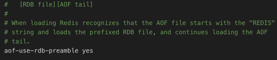 其中 yes 表示已经开启混合持久化,no 表示关闭,Redis 5.0 默认值为 yes。如果是其他版本的 Redis 首先需要检查一下,是否已经开启了混合持久化,如果关闭的情况下,可以通过以下两种方式开启: