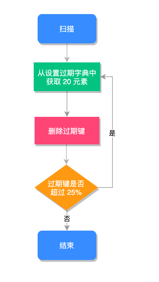 hz 10,Redis 会随机抽取 20 个值,删除这 20 个键中过期的键,如果过期 key 的比例超过 25% ,重复执行此流程,如下图所示: