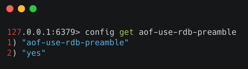 config get aof-use-rdb-preamble 命令,执行结果如下图所示: